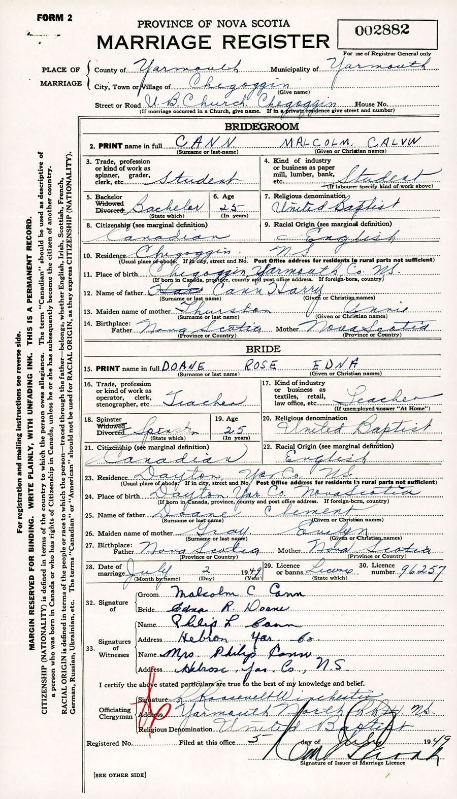 Registration: Year: 1949 number: 002882