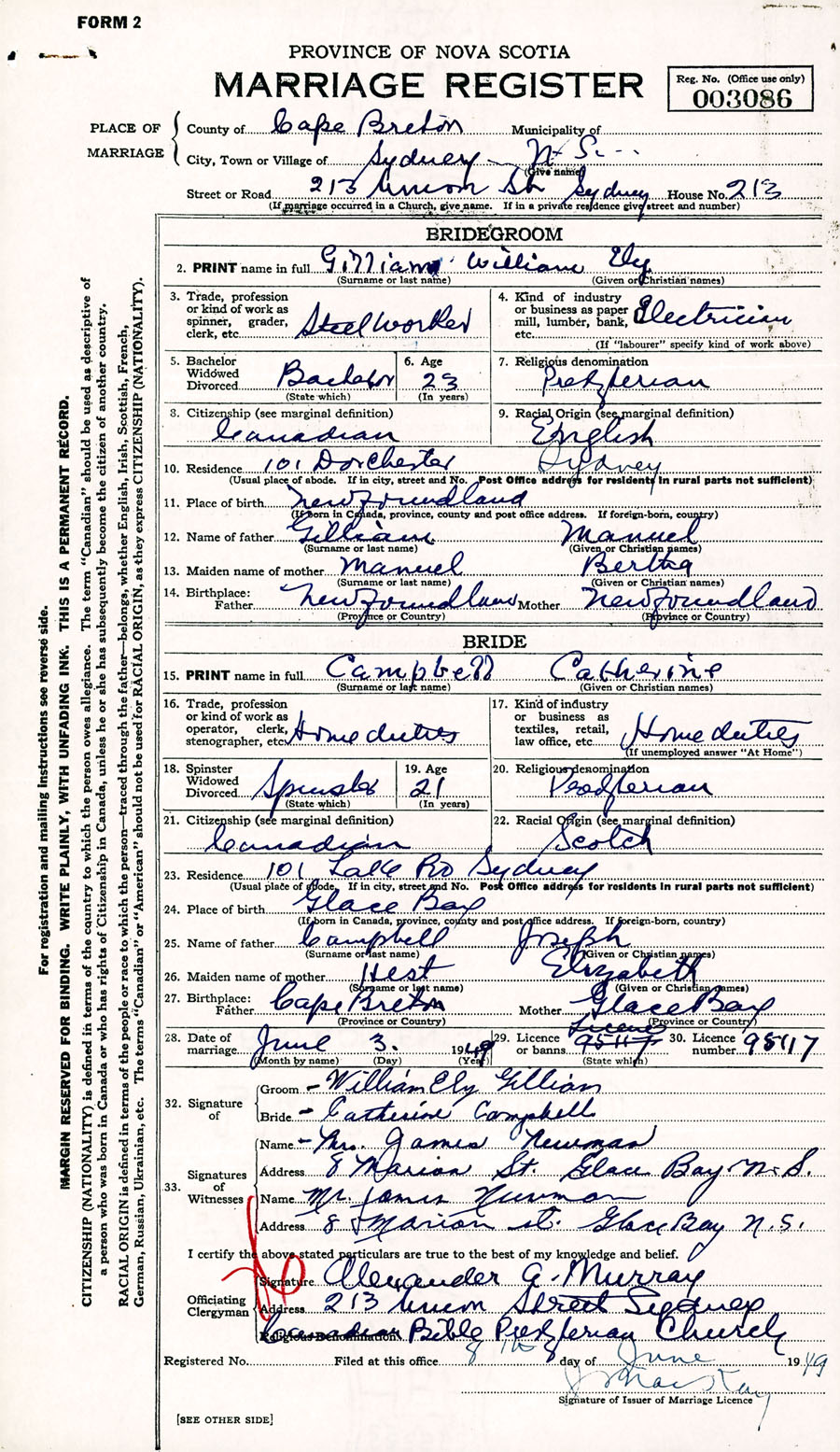 Registration: Year: 1949 number: 003086