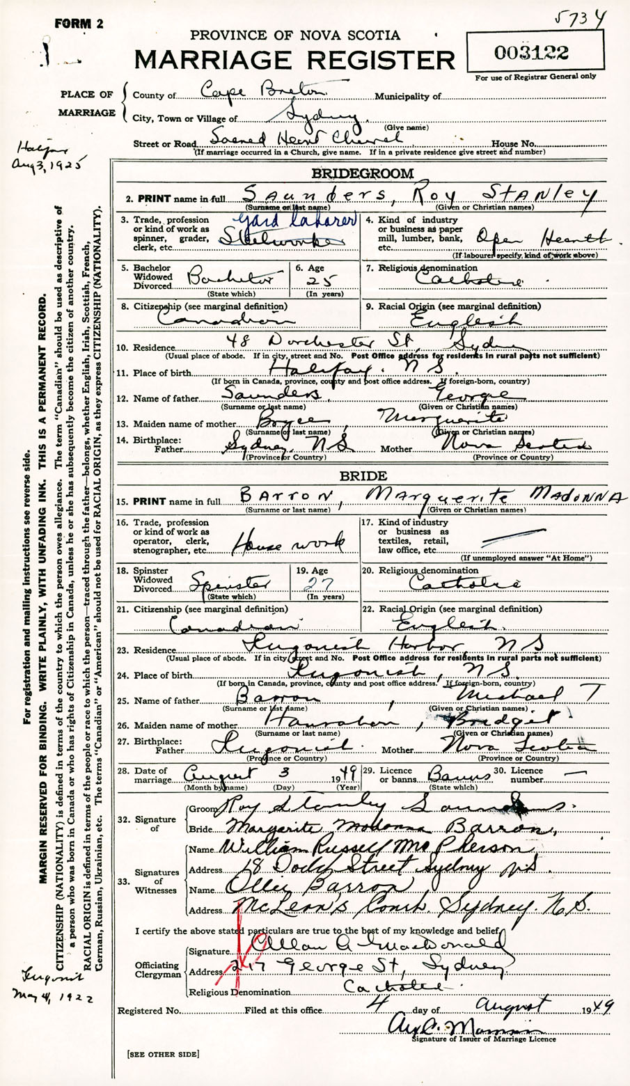 Registration: Year: 1949 number: 003122