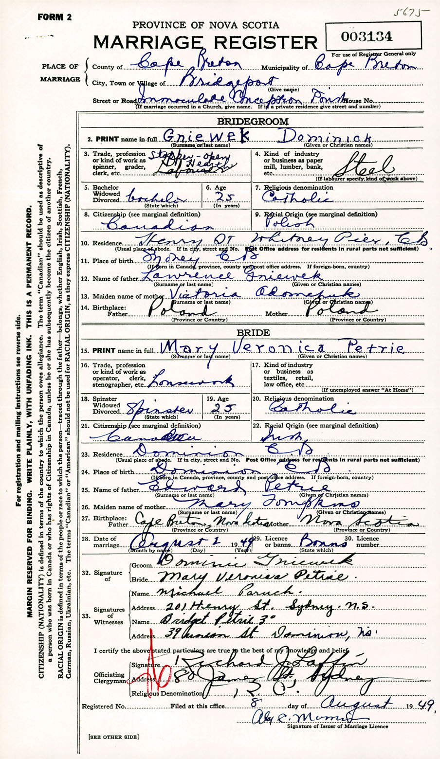 Registration: Year: 1949 number: 003134