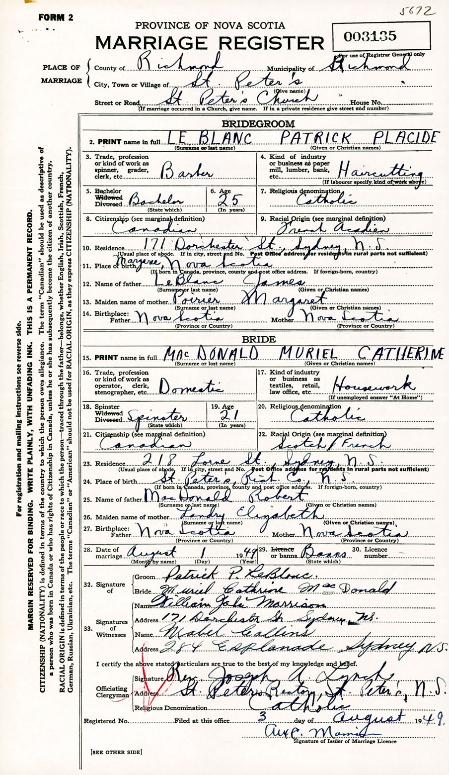 Registration: Year: 1949 number: 003135