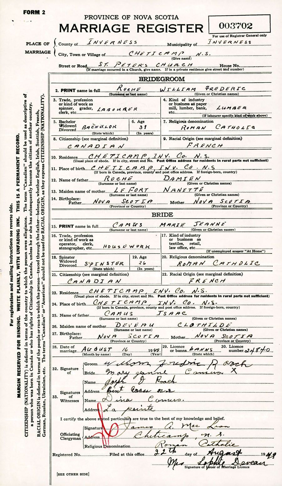 Registration: Year: 1949 number: 003702