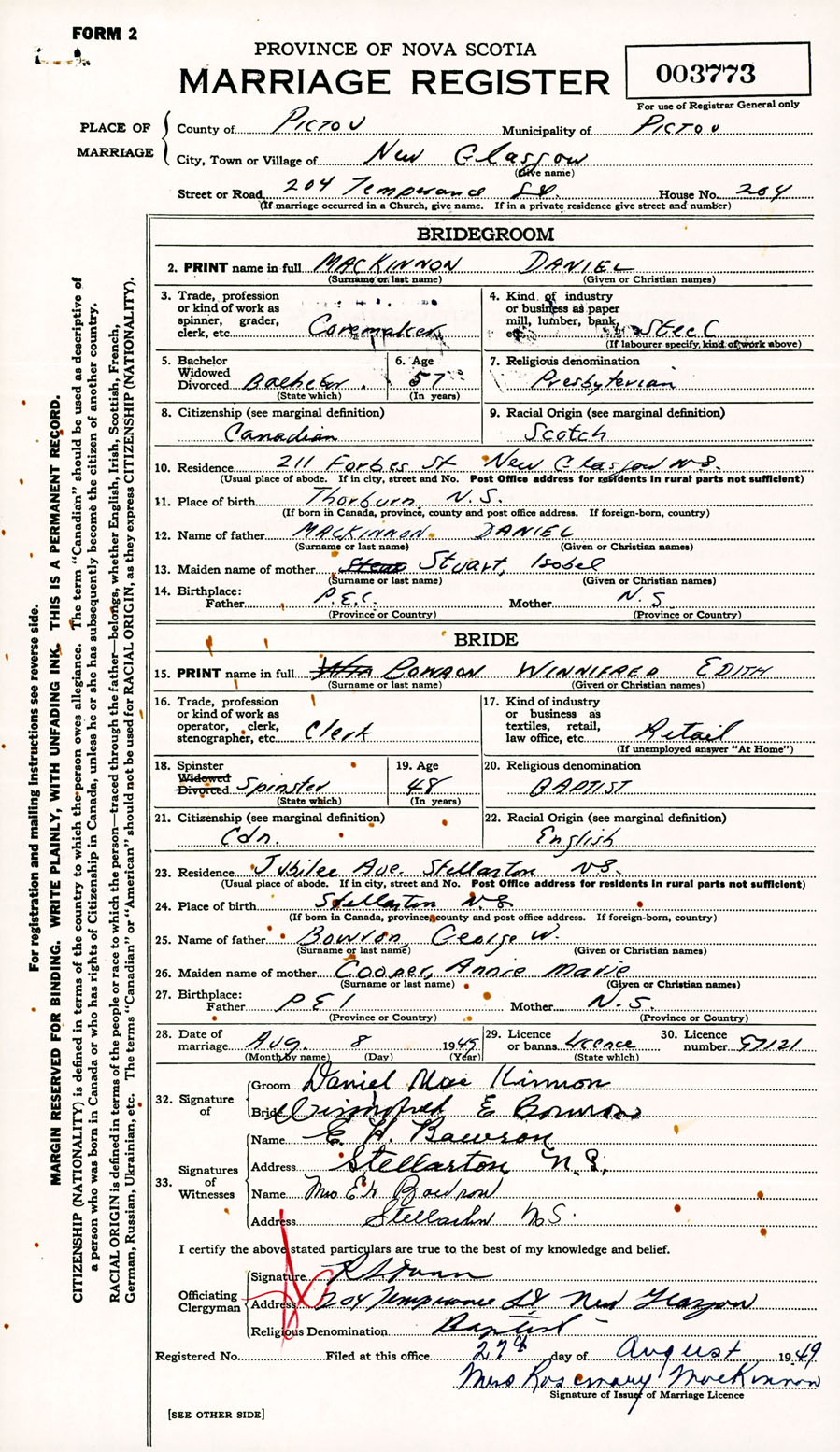 Registration: Year: 1949 number: 003773