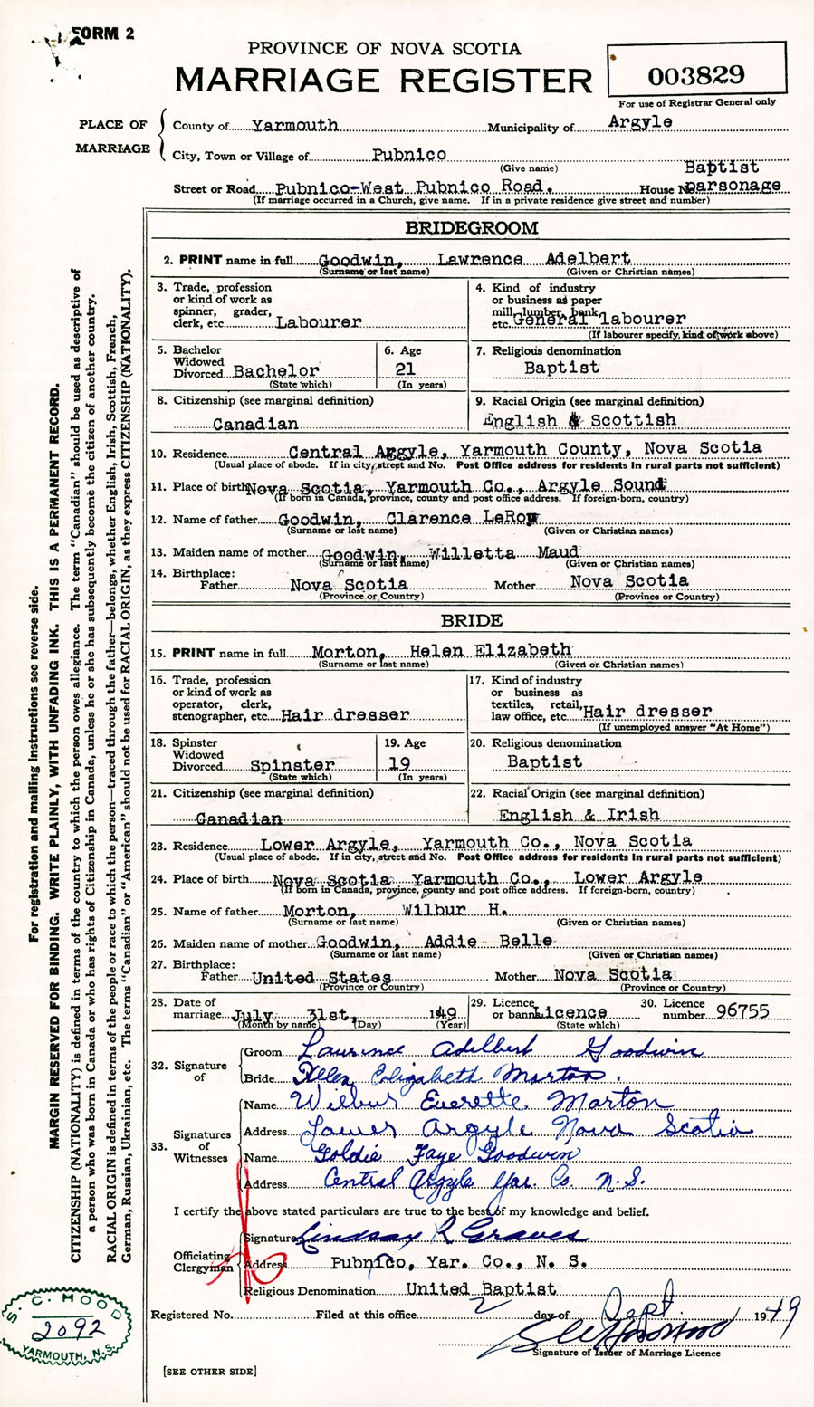 Registration: Year: 1949 number: 003829