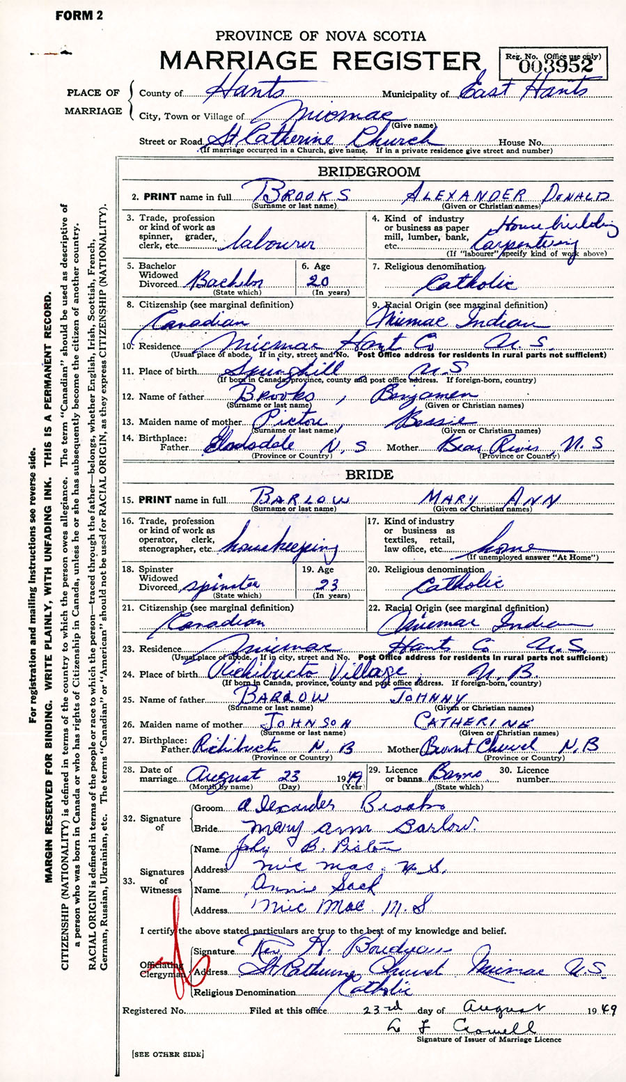 Registration: Year: 1949 number: 003952