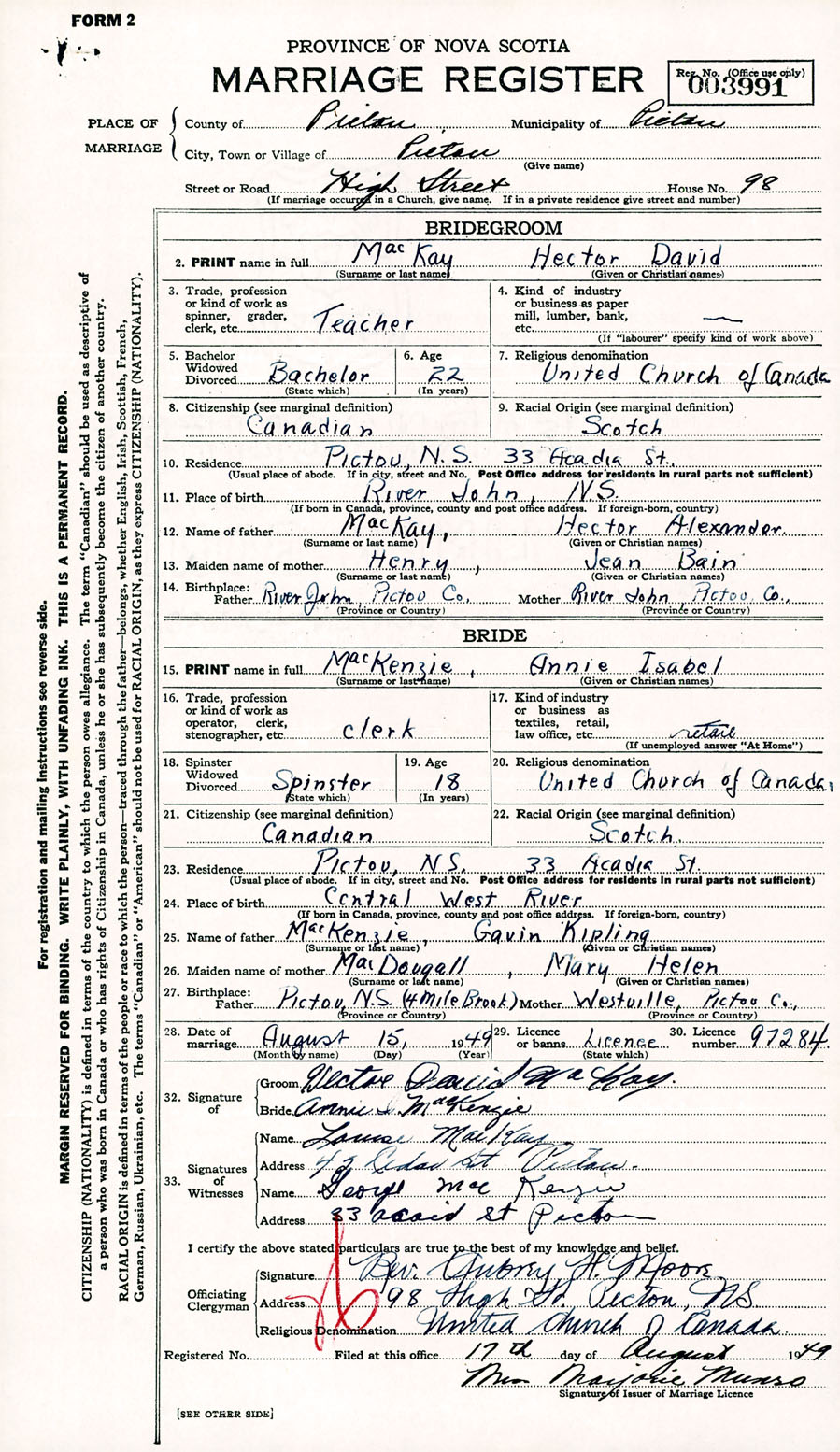 Registration: Year: 1949 number: 003991
