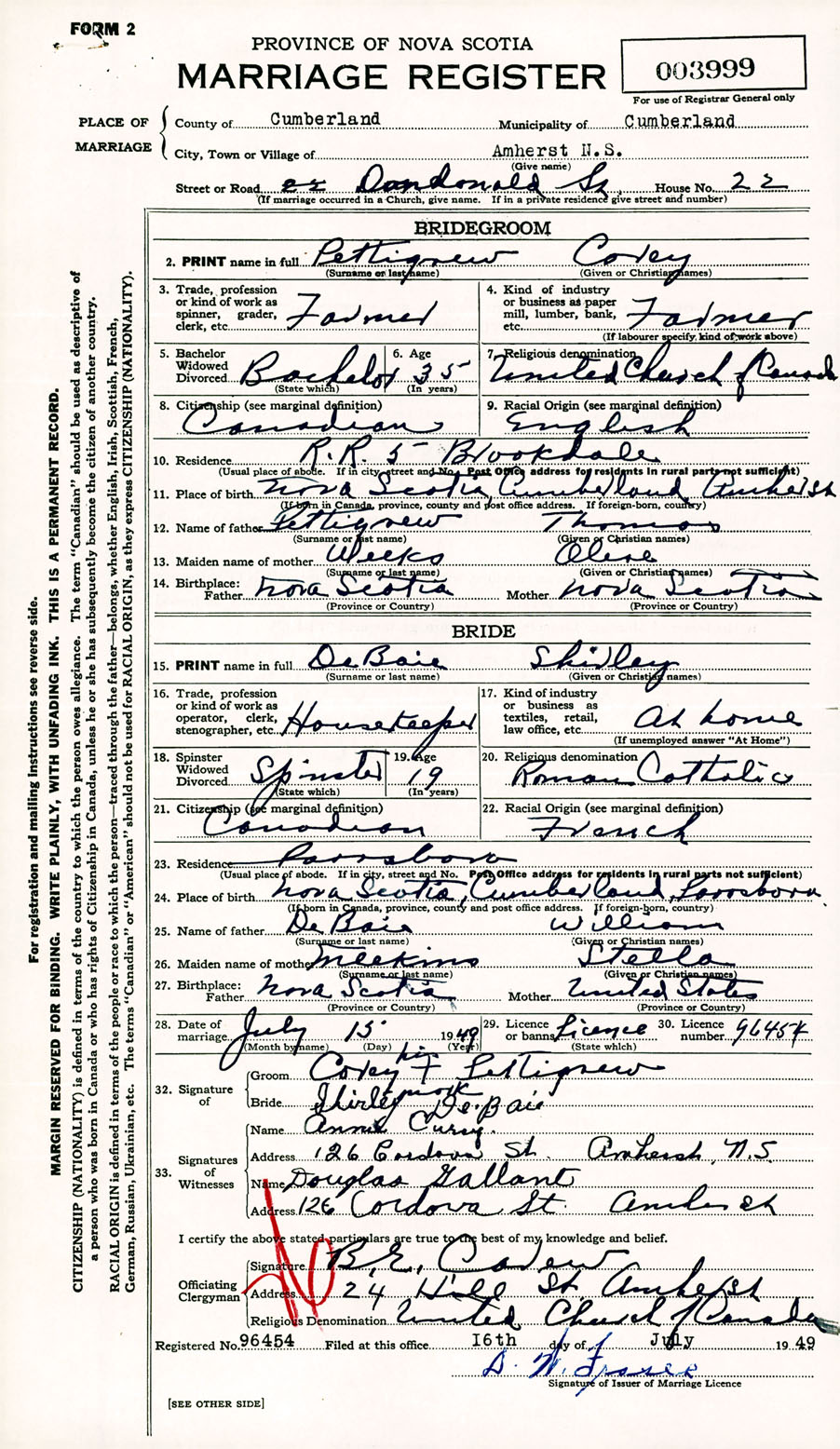 Registration: Year: 1949 number: 003999