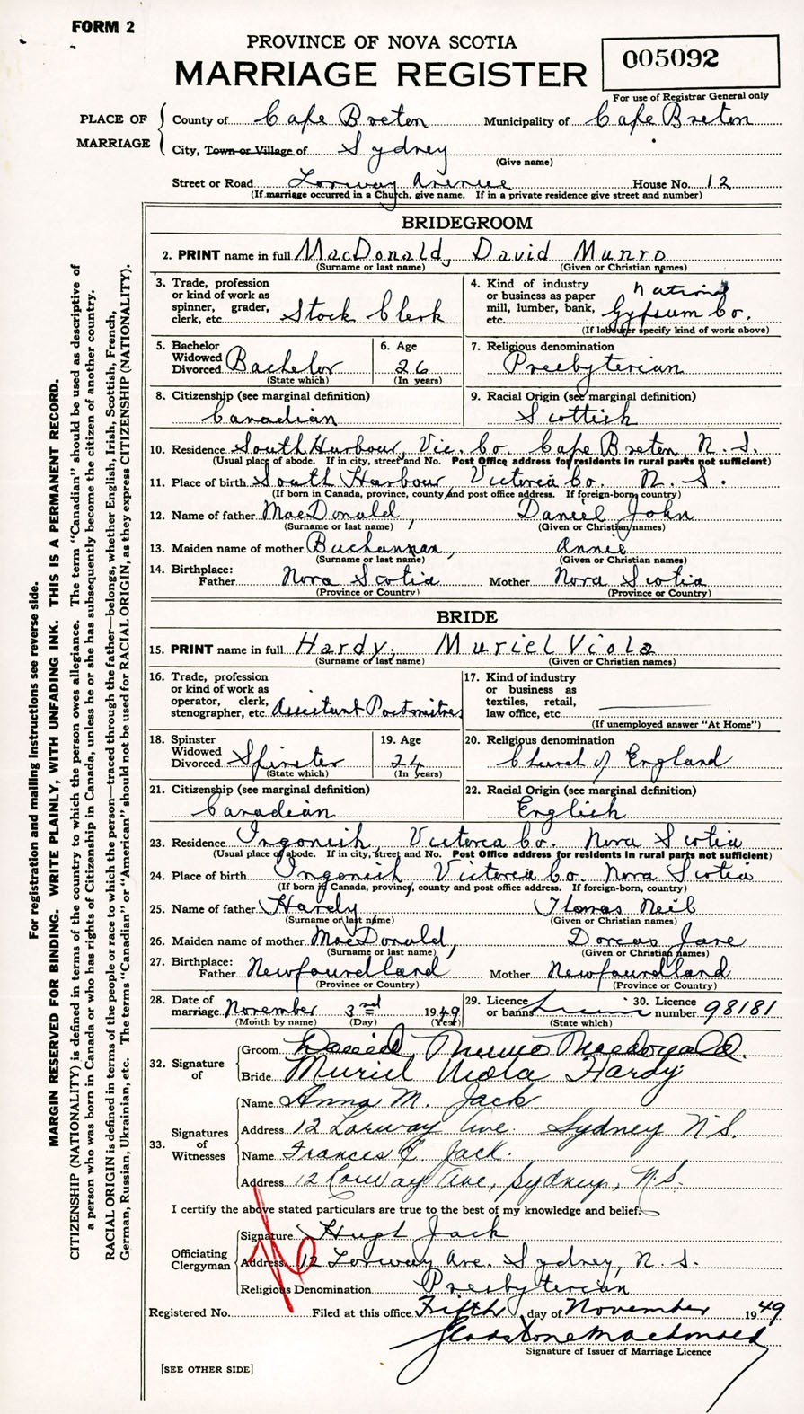 Registration: Year: 1949 number: 005092