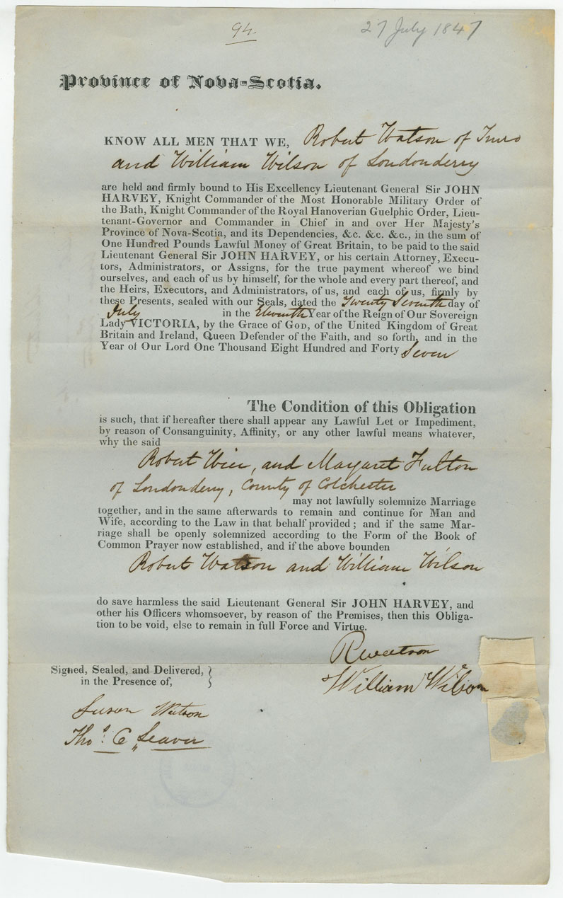 Note: signed by Robert Watson, Truro and William Wilson, Londonderry