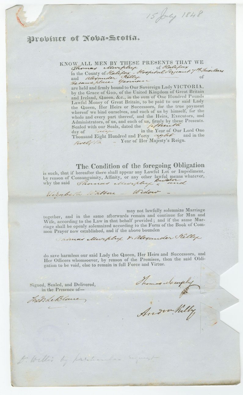 Note: signed by Alexander Kelly, Halifax, yeoman